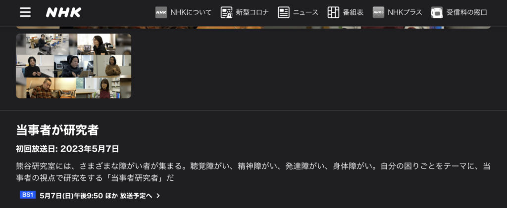 『当事者が研究者』BS1 未分類 Twitter Facebook はてブ Pocket LINE コピー 2023.05.06 東大最先端研究所では、さまざまな当事者が研究者として働いています。 中島みゆきの歌に 『今はこんなに苦しくて、涙も枯れ果てて、2度と笑顔にはなれそうもないけど』 という歌詞があります。 苦しいけれど、未来に笑うことはできます。 NHK BS1 2023/5/7 21:50〜 苦しんだ先に 【研究者】になった方が出演します。 最後までお読みくださり、ありがとうございました。