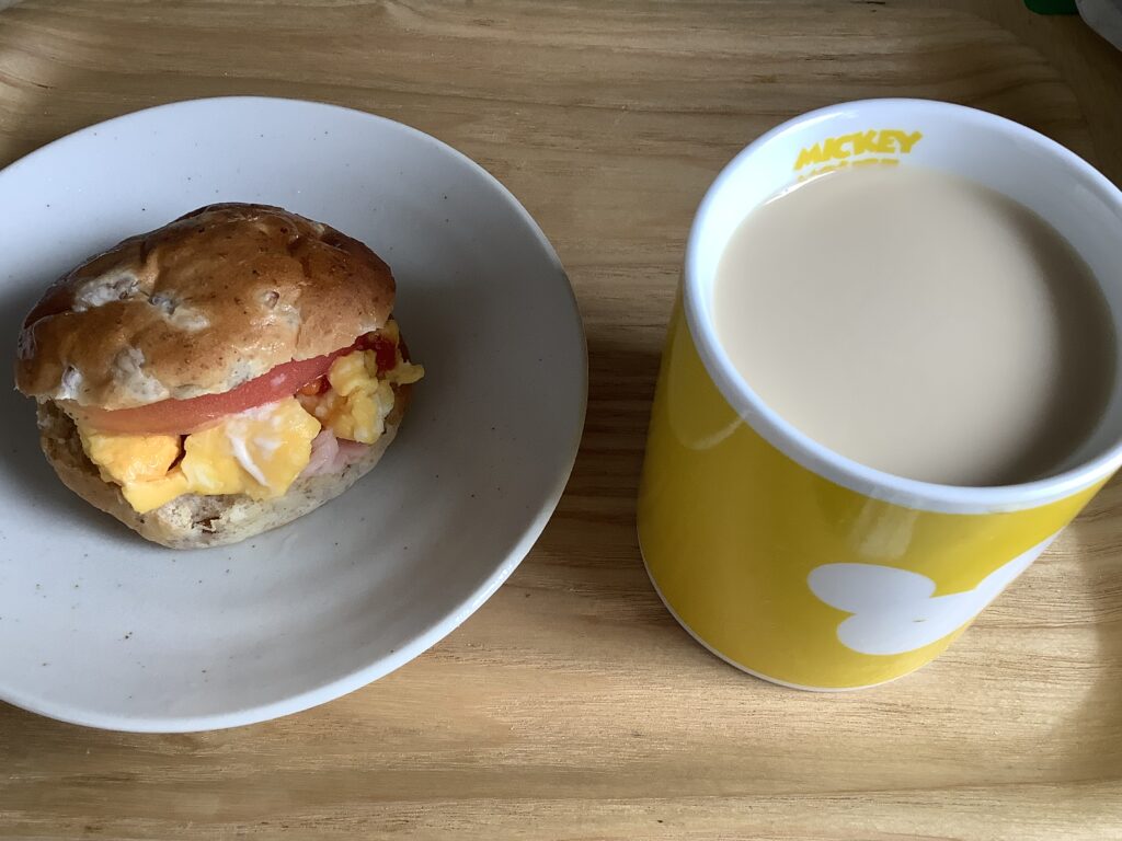 帰宅し、たまごを溶きレンジにかける。別皿にベーコンをのせてレンジにかける。トマトをスライスして、買ってきたライ麦パンにすべてを挟んでケチャップとマヨネーズをかける。